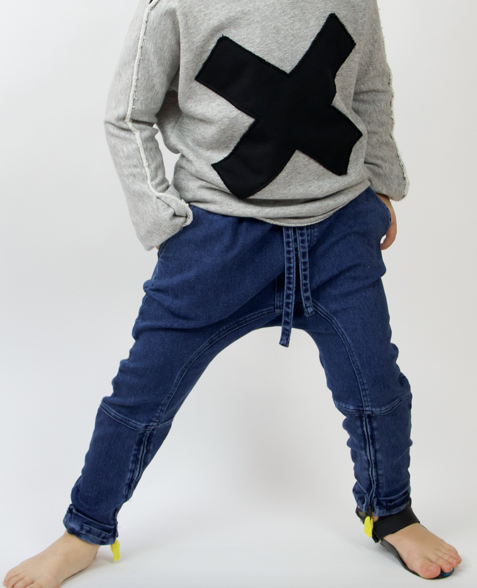 Featuring accessible style elements including a drop crotch, stretch waist, and discreet chunky long pulls and zips at the leg to fit over orthotics, AFOs, leg braces and casts easily, these jeans are on-trend yet full of adaptive features.