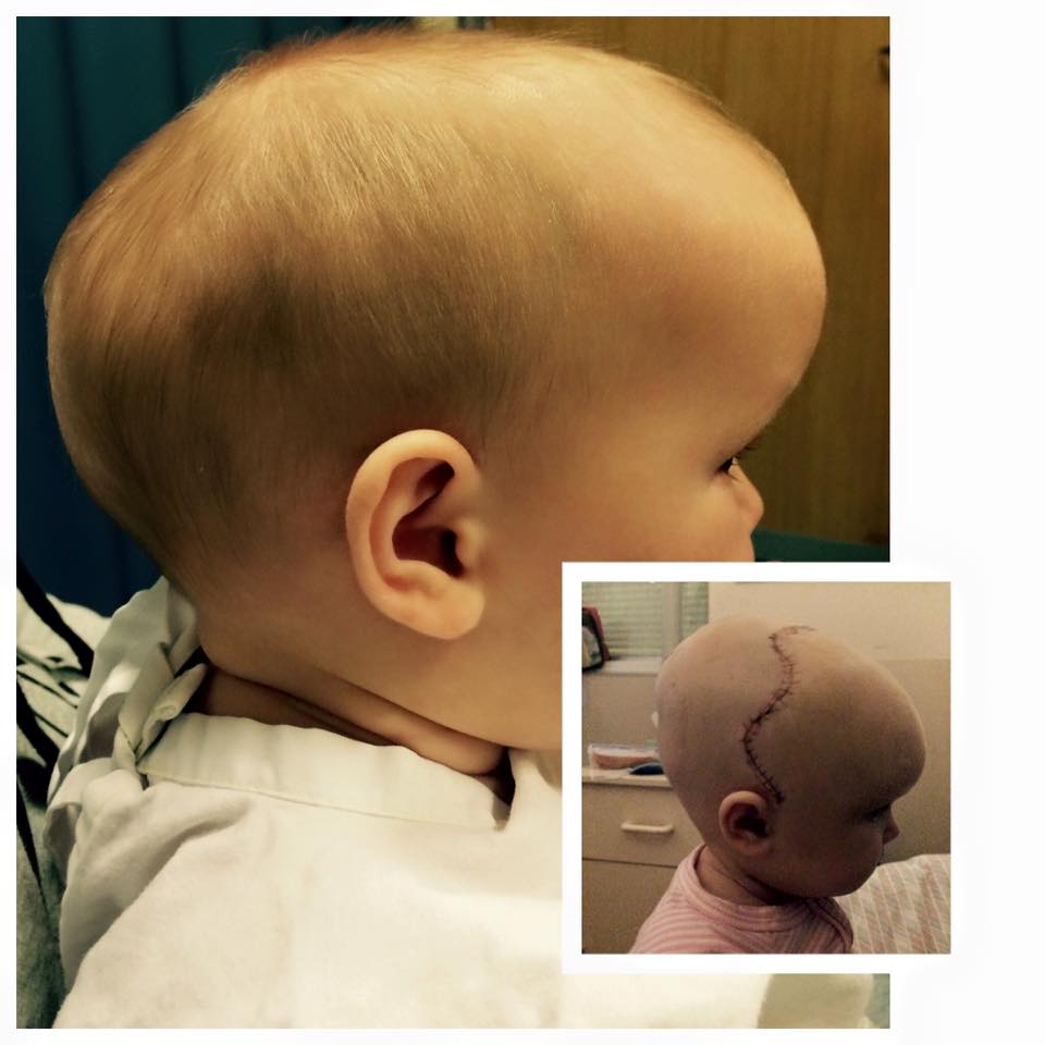 The only treatment for her little girl was to undergo major surgery. This entailed removing her scalp, cutting the skull away, removing and remodelling her forehead and her occipital bone (rear of her head) – all at five months old.