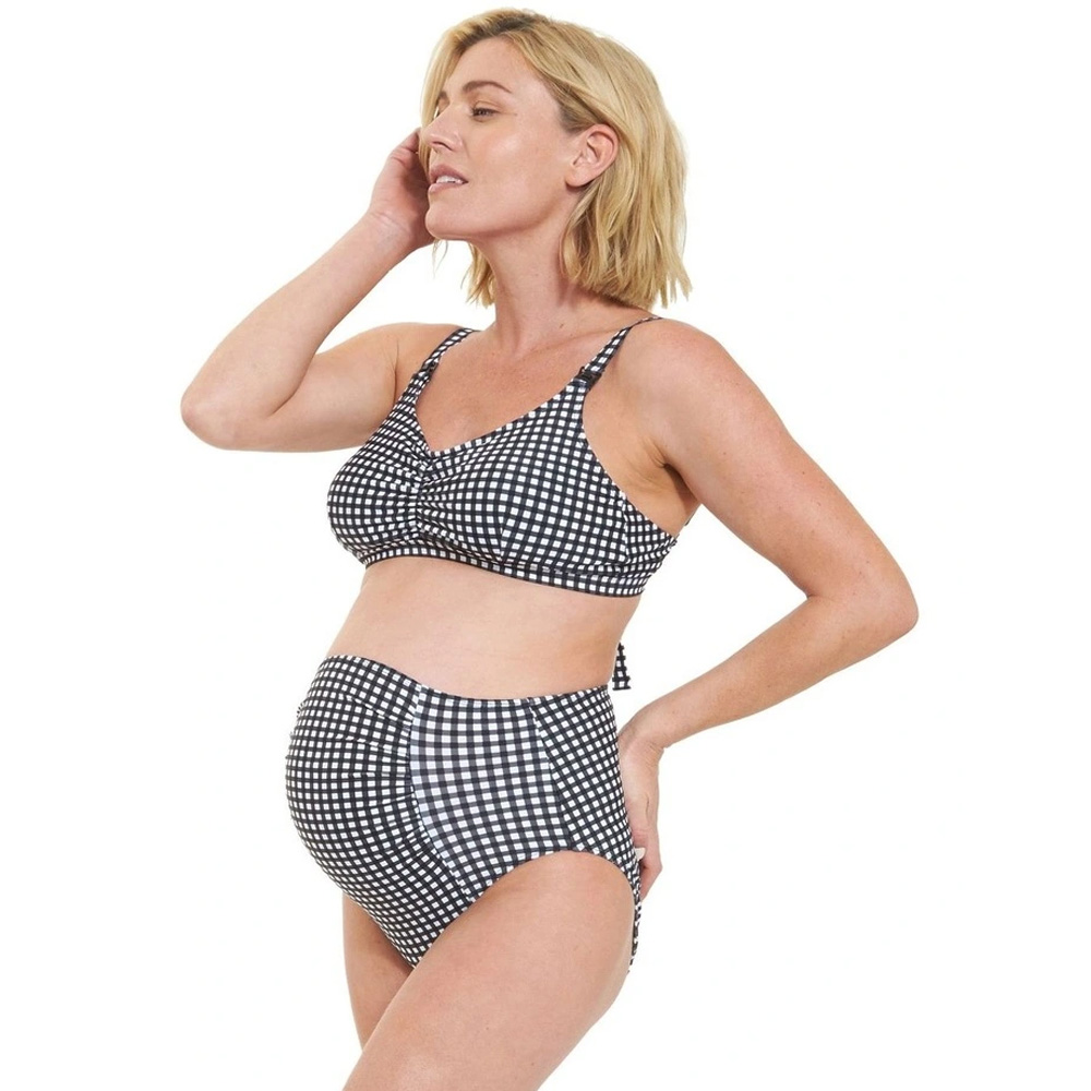 A classic black and white check 2 piece bathing suit, designed for maternity and nursing. The Check Nursing Bikini top features a simple V neck, skinny straps and clip release nursing access. The high waisted bottoms feature gathering across the tummy which will provide plenty of room during pregnancy as well as a flattering silhouette post pregnancy.