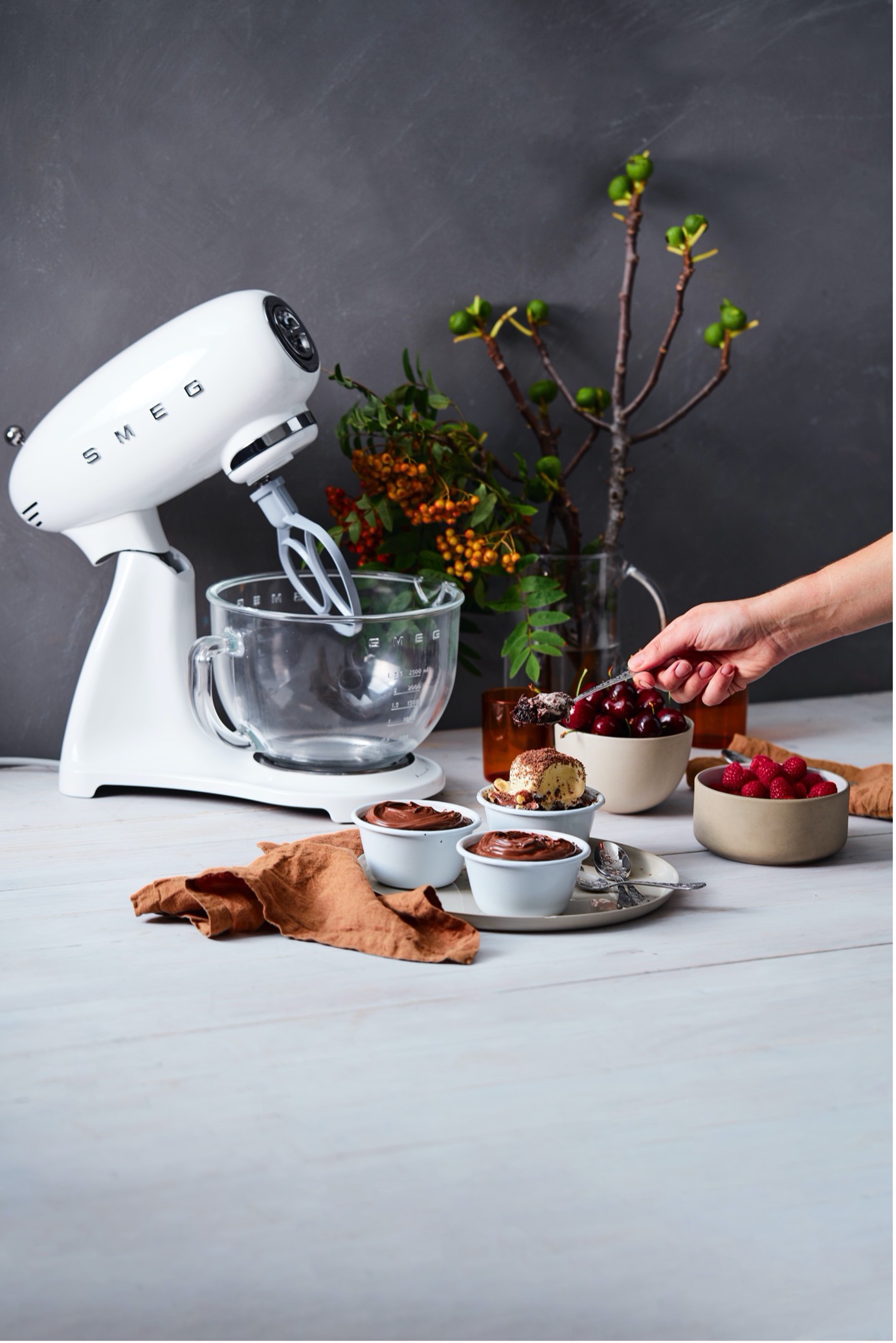 - Add sugar and eggs to the chocolate mixture and whisk until smooth. Fold through ground hazelnuts. Spoon mixture into prepared dishes.