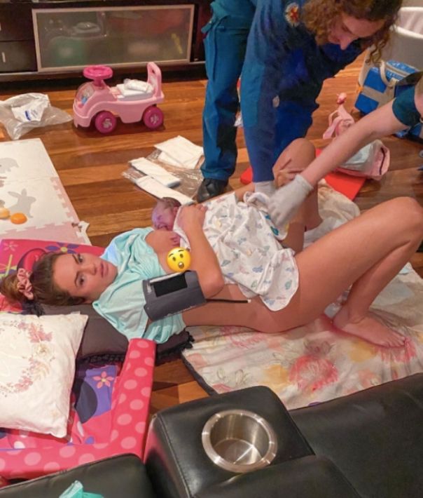Emily Skye delivered her baby boy at home, on her living room floor, with help from ambulance workers in June.