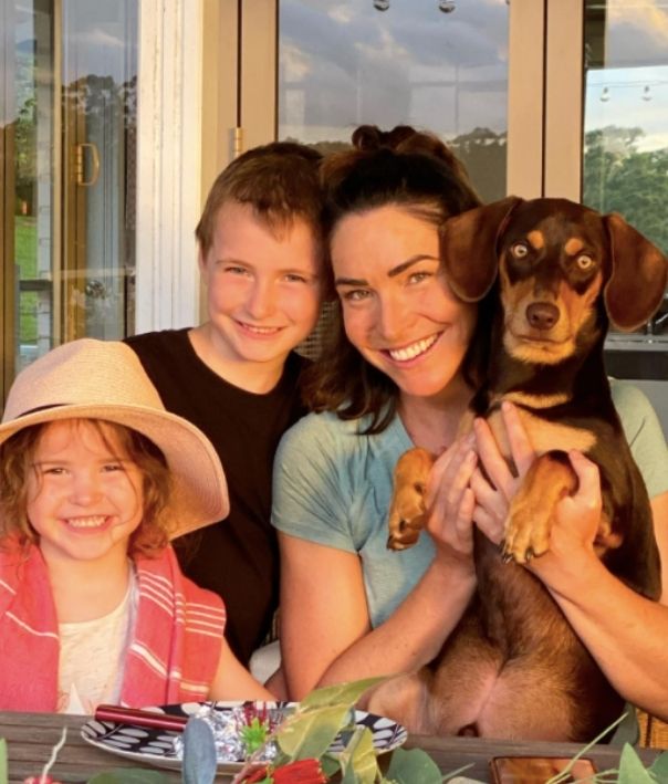 Former Olympic swimmer Giaan Rooney with her pup, Roy, and two children, Zander, seven, and Alexa, four.