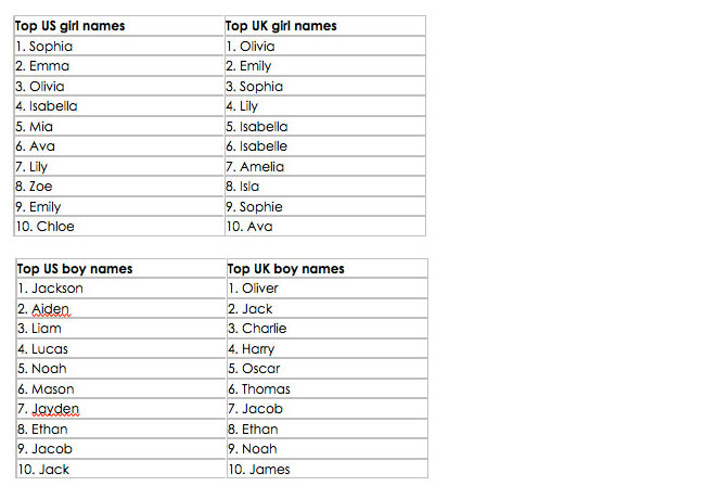 BabyCentre has released its list of the top 100 baby names for the UK and the US, based on details provided by a membership of more than half a million parents in 2013.