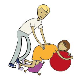 Sit on a fitness ball, with your feet a comfortable distance apart and flat on the floor. You can place your hands on your knees for support. Now rock from side to side. Your birth partner can massage your shoulders and back to ease pain further.