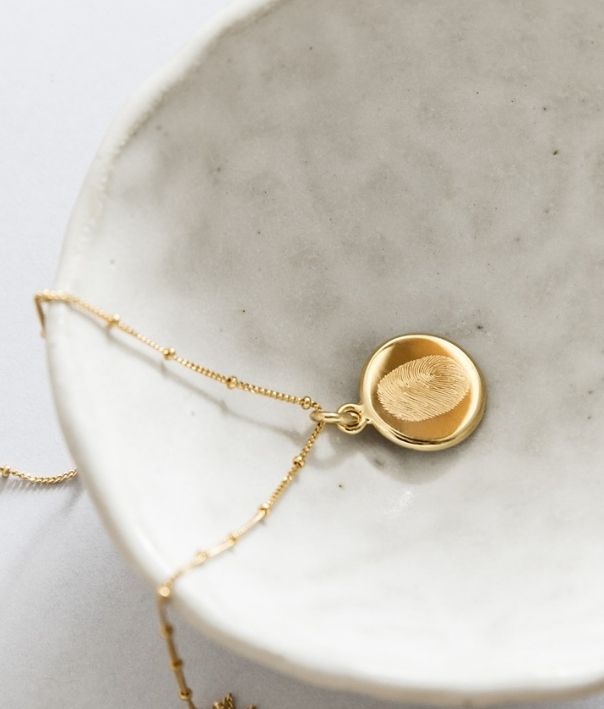 Diamond engraved with a single fingerprint, the Classic Fingerprint Necklace from Deja Marc comes complete with a complimentary initial or name engraving for extra meaning.