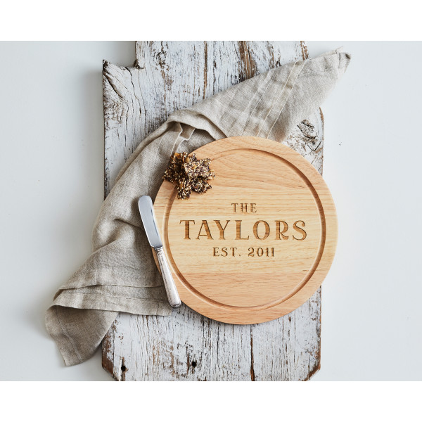 A high-quality, laser engraved round serving board that can be personalised with a surname and a special year, such as the year of a wedding or the year a first child was born.