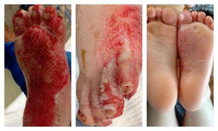 Camryn’s feet after the accident (left and middle), and exactly a year later (right).