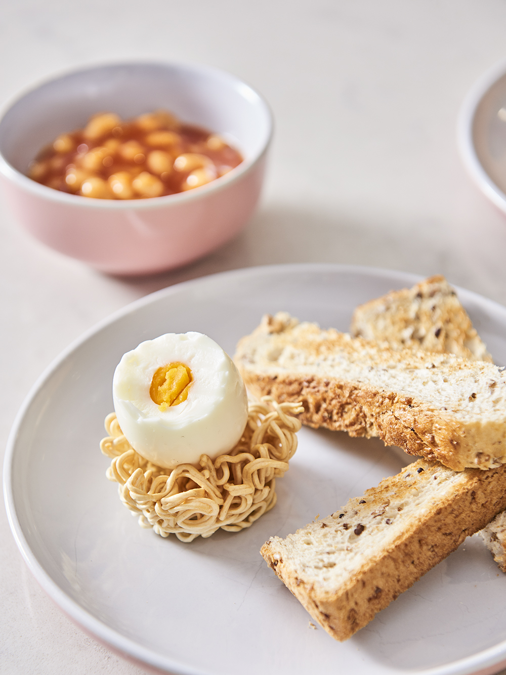 After a few minutes peel the egg but be careful as it’s soft and runny inside. Once the noodles are cooked, take them out of the muffin tray and pop on a plate.