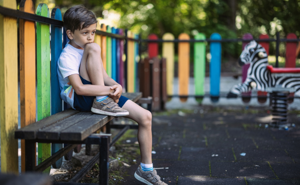 Primary school aged boy looking sad as he sits alone in a colourful playground