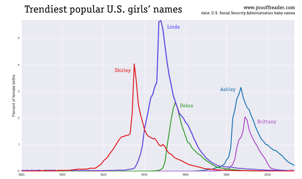 Curiously, nine out of 10 names in the top-ten list belonged to girls, with Dewey being the sole boy’s name, popular from 1897 to 1903. Presidents strongly influence trends in boy’s names, with Woodrow spiking around 1918, in line with Woodrow Wilson's presidential term. Dawson also spiked the year Dawson’s Creek first aired, in 1998.