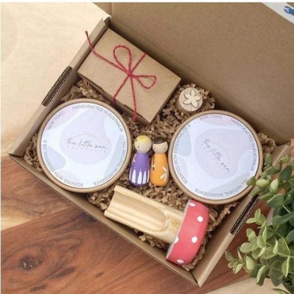 Complete with two hand-painted fairy peg dolls, this scented kit includes handmade play dough with a wooden rolling pie and bamboo cutting knife, a mushroom fairy house and a selection of additions such as flowers, sticks, felt balls and pebbles.