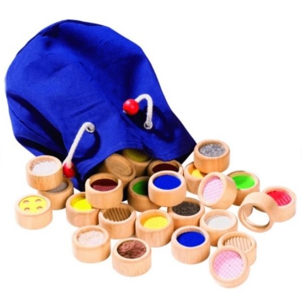 Start by putting the 32 wooden pieces into pairs according to colours and matching surfaces. Keep one of each pair out of the bag, then put you hand in and try to feel for a matching pair. This works on sensory skills, memory and perception and can be played solo or together.