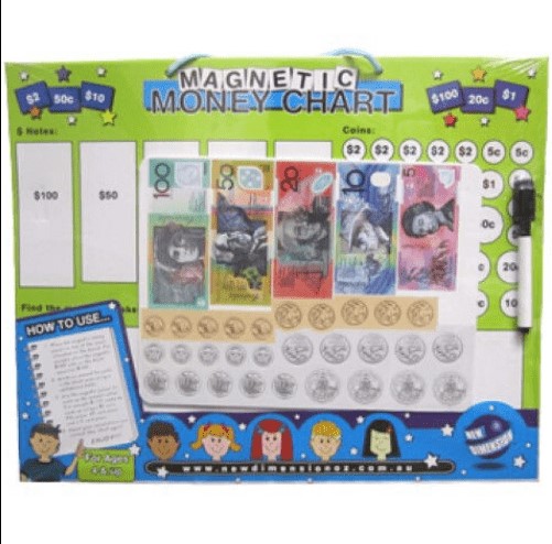 A fantastic learning tool that teaches the basics of money, counting and how to give change, in a fun and interactive way. The magnetic backing makes attaching the chart to a fridge or whiteboard easy, which works well for kids who like to be on their feet.