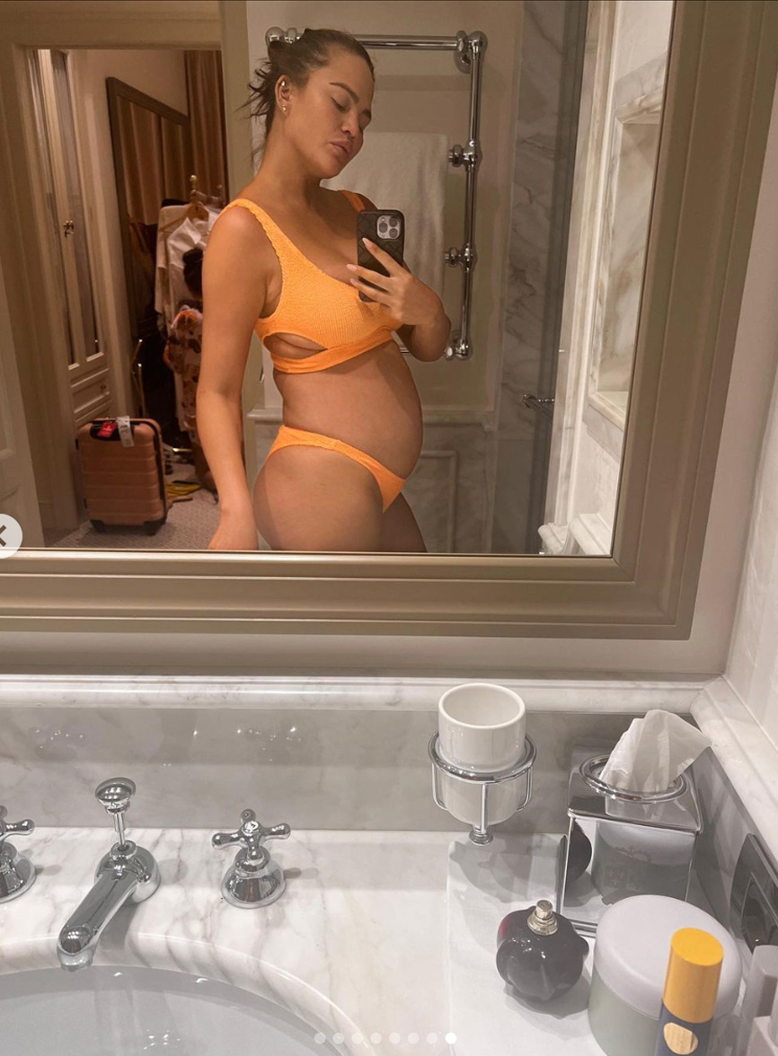 There’s no such thing as too many baby bump pics! In addition to the Italian poolside bump pic, Chrissy also shared a mirror selfie of her wearing a bright orange bikini, new bloom on display.