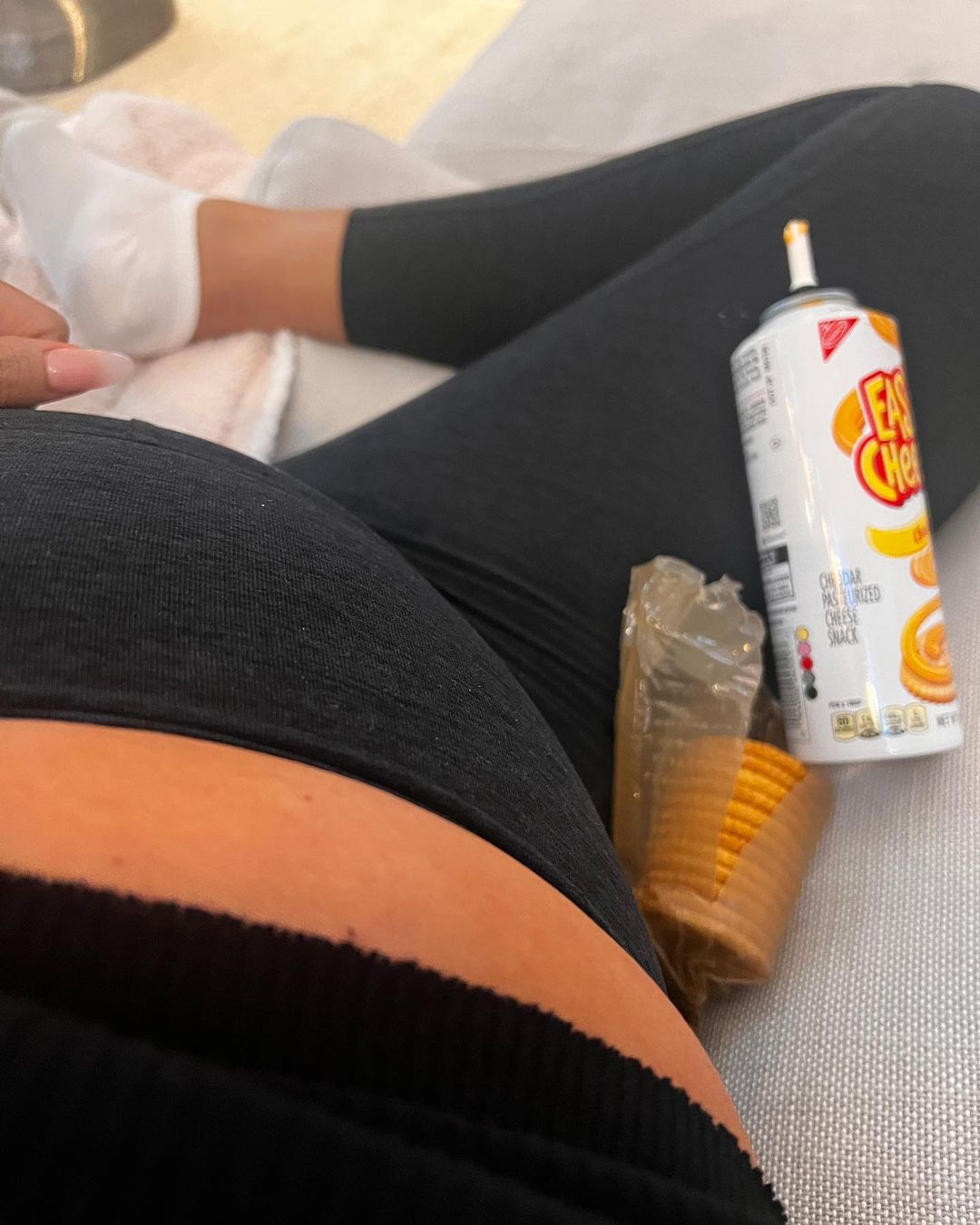 Spray cheese and crackers are the order of the day for this mum-to-be!