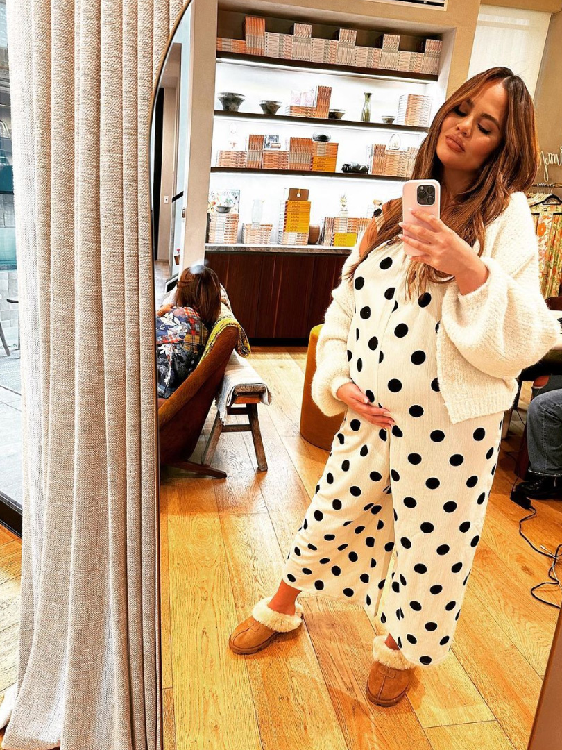 As her burgeoning bump grows, Chrissy poses at home in cute pyjamas, alluding to her impending due date as she wrote: “Oh dear. We are getting there!”