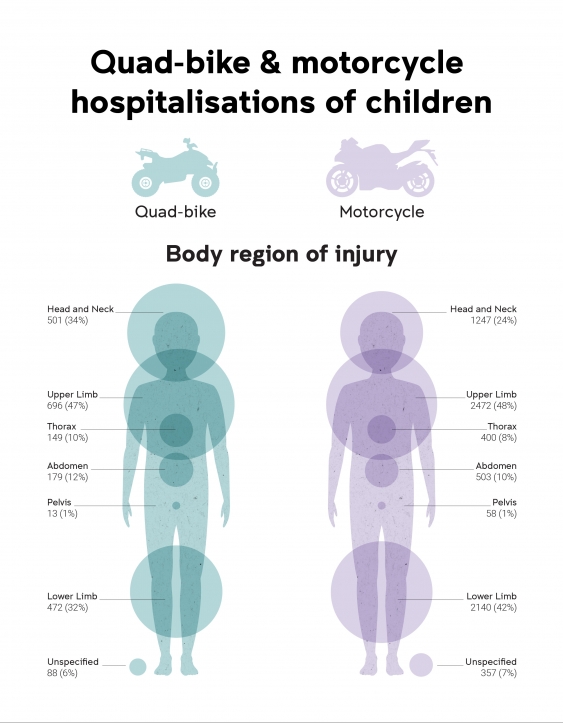 Infographic comparing body region injuries of children riding quad bikes and motorcycles.