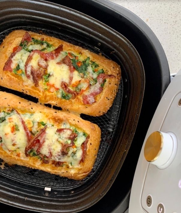 - Inside each hollow, arrange spinach, torn pieces of cooked bacon, capsicum and shallots. Then transfer to the basket of the Philips XXL airfryer with Smart Sensing Technology.