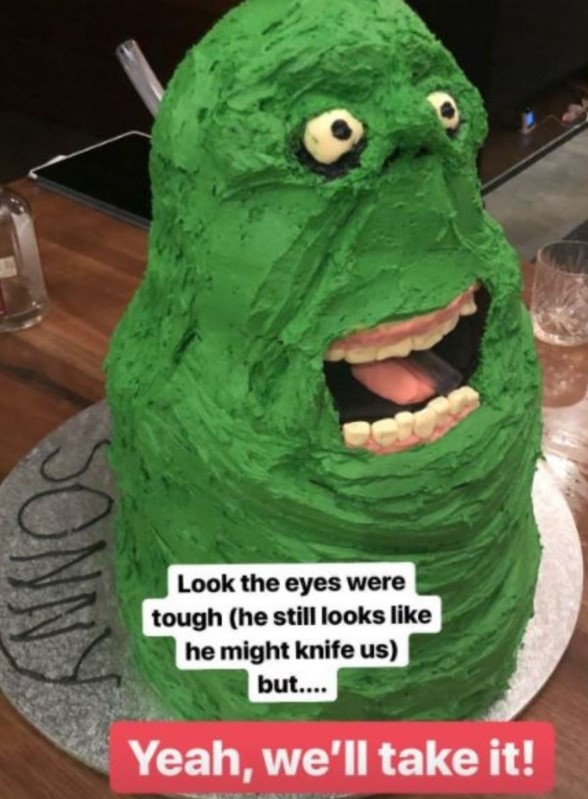 “Slime fairly happy with how the big moment played out,” the comedian joked about his six-layer cake that spewed green icing!