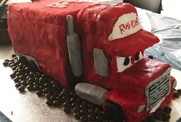 “This is the Mack truck cake my husband made (the night before, starting at 8:30pm, equipped with many beer and no idea) for our Disney Cars fanatic of a son,” said wife Zoe.