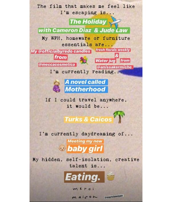 Jasmine also shared a meme that gave an insight into how she is coping in lockdown. Where she was asked to fill in the remainder of this statement: “I’m currently daydreaming about” she answered “Meeting my new baby girl.”