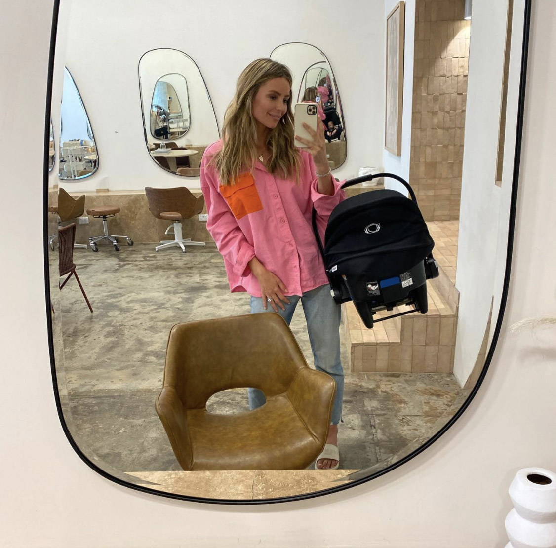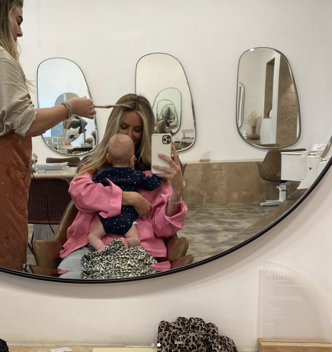 Taking to her Instagram account, the 38yo mum-of-two shared a series of images showing little Hendrix resting against his mum’s tum while the stylist did their work, and resting in his carrier while his mum posed in the salon mirror.