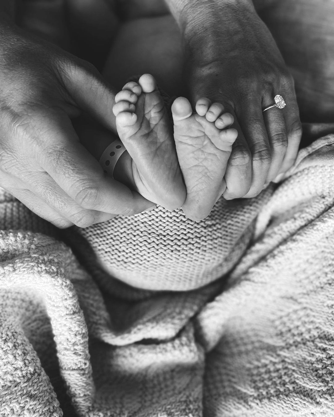 The proud parents each shared the same sweet image each to their Instagram accounts of their hands cradling their new son’s feet captured in black and white.