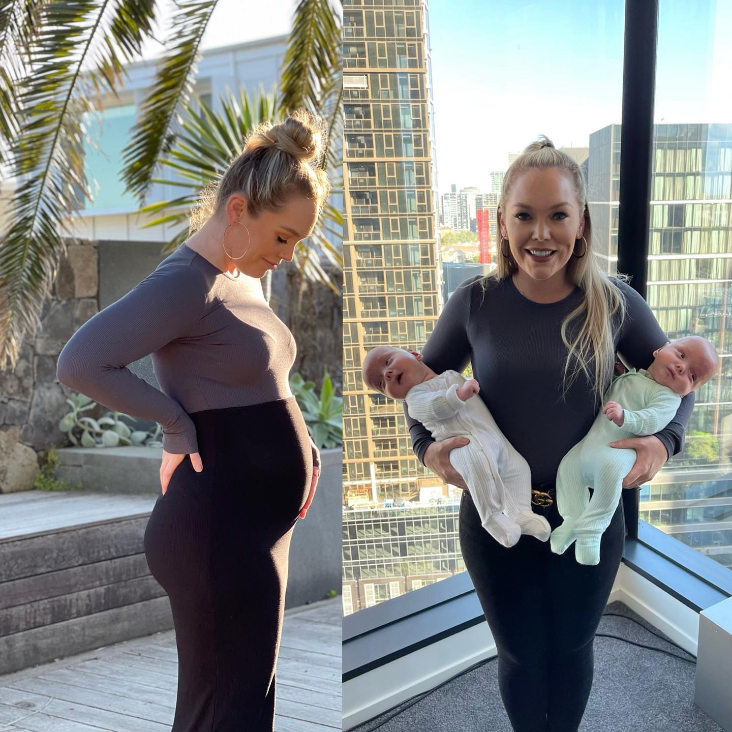 Showing more of the positivity that the Melbourne mum is once more filled with, Liss shared a photo of her at five months pregnant alongside of the boys at five months old, saying the pregnancy snap is one of the few beautiful ones she has.