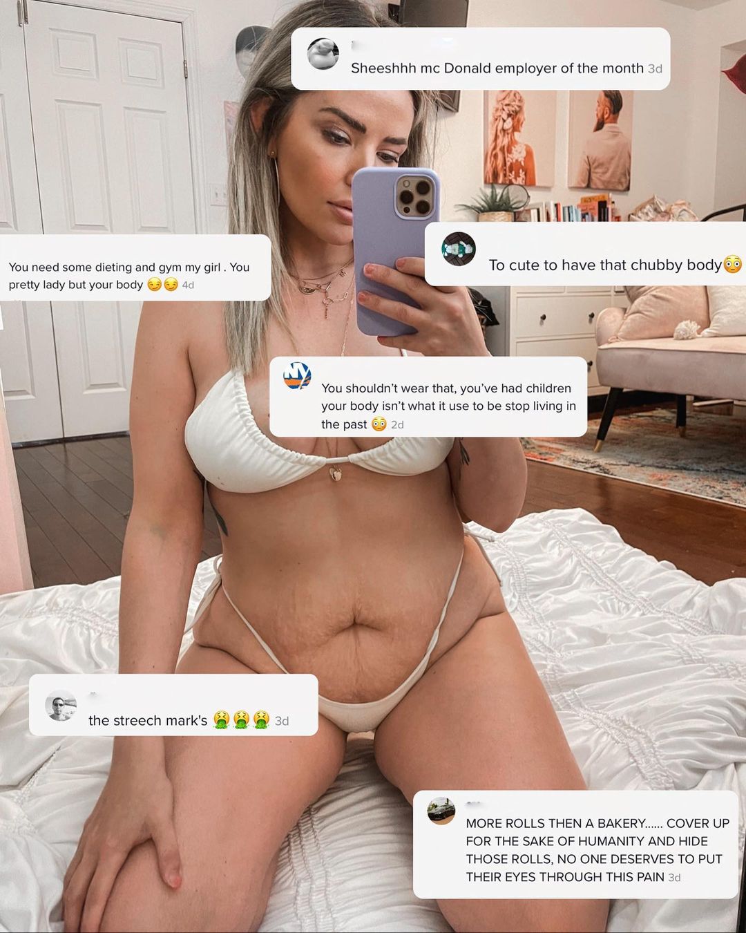 The 36yo Canadian, who has amassed over 1.9million followers on her @thebirdspapaya Instagram account, recently posted three images of herself wearing a bikini and plastered with screen grabs of the mixed kind of comments people make about her body.