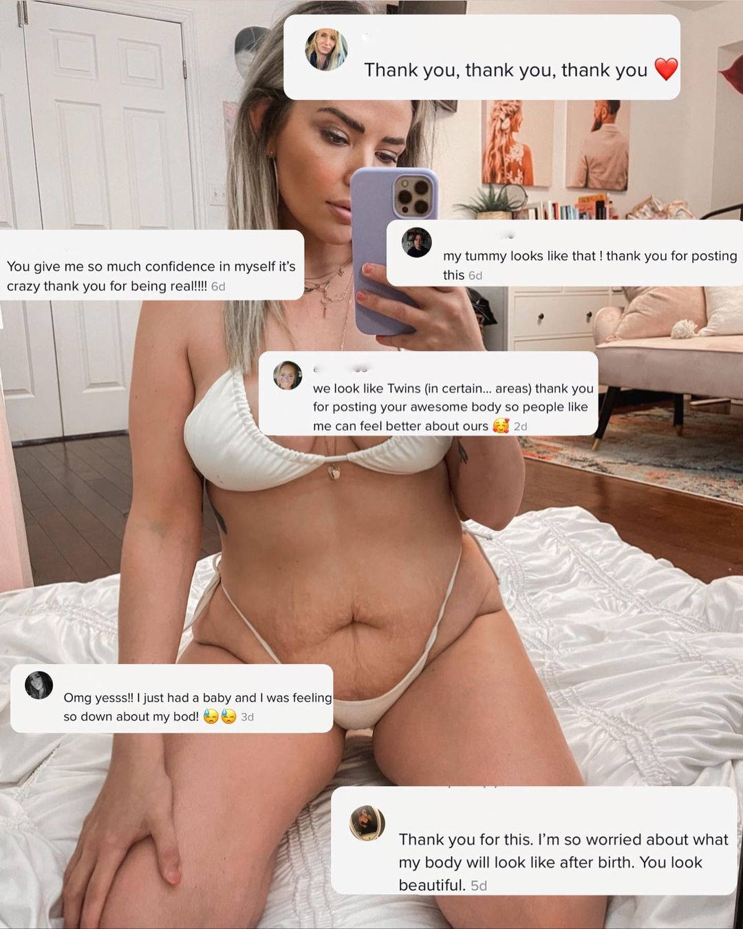 Sarah followed the image with nasty comments with the same images covered with comments written by women thanking her for sharing pictures of her body.