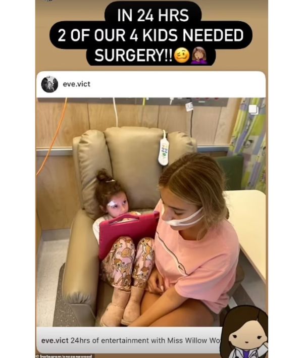 The drama began on Friday, when Eve headed into hospital to have her tonsils out. While she was recovering, Willow had a nasty fall at preschool and received a deep cut to her forehead. She was rushed to hospital and required surgery.