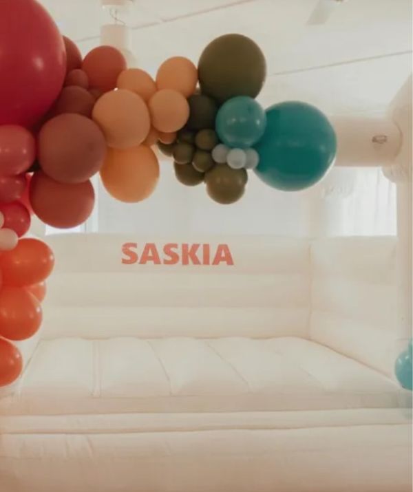 The personalised white jumping castle features a balloon installation and it looks so luxe.