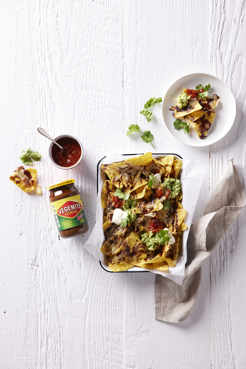 - Pour VEGEMITE & Cheese over the nachos. Sprinkle over grated cheese and place in the oven for 10-12 minutes until the cheese has melted.