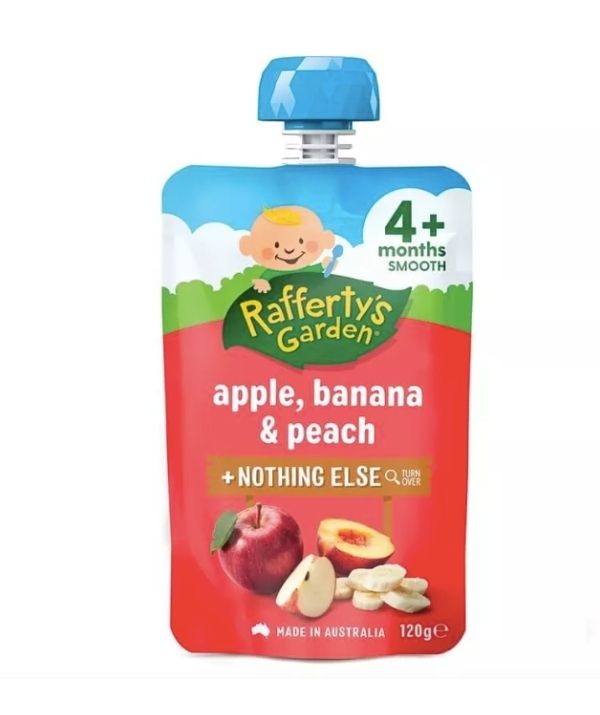 Rafferty’s Garden Apple, Banana & Peach 4+ Months Pouch, RRP $2