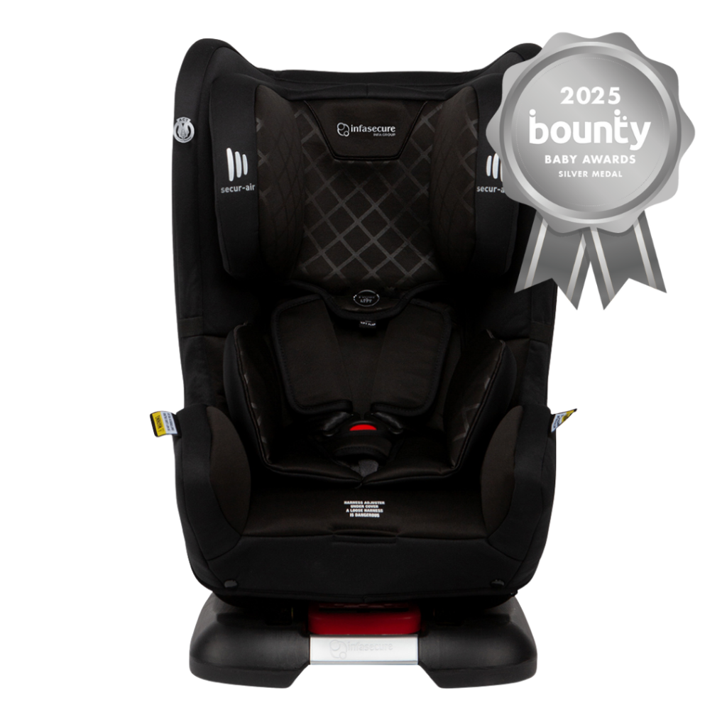 InfaSecure Quattro Onyx is the narrowest child seat with an in-built harness on the market today. It measures an incredibly narrow 420mm across at its widest point in both Rearward and Forward Facing modes. Quattro also features an ultra-compact Rearward Facing depth, perfect for smaller vehicles (or taller front seat travellers).
