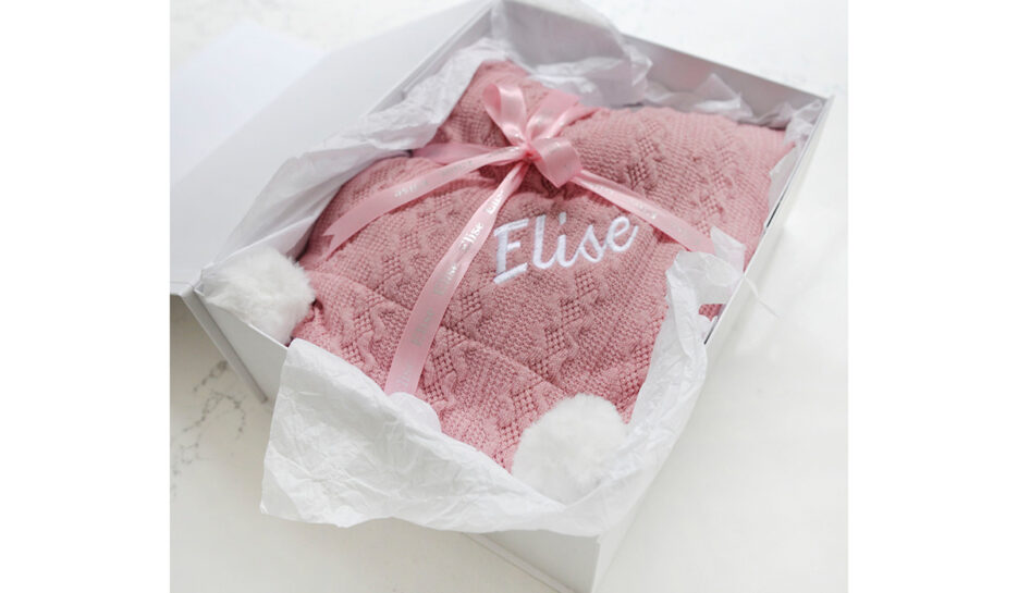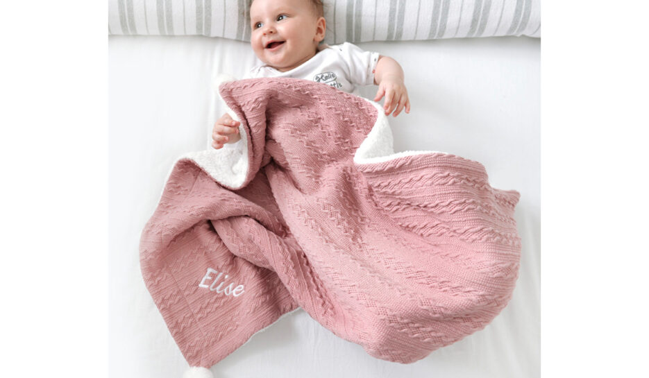 A Type Of Design Personalised Dusty Pink Cable Knit Pom Pom Blanket is a beautifully soft pink cable knit pom pom blanket, ideal for mum and baby. This blanket is the perfect size to use as a nursing blanket for mum and baby. Add your own name which we will embroider onto the blanket in white thread. The name will be embroidered in lower case, except for the first letter, which will be UPPERCASE. The reverse of the blanket is made from lovely soft white sherpa, making it cosy and warm.