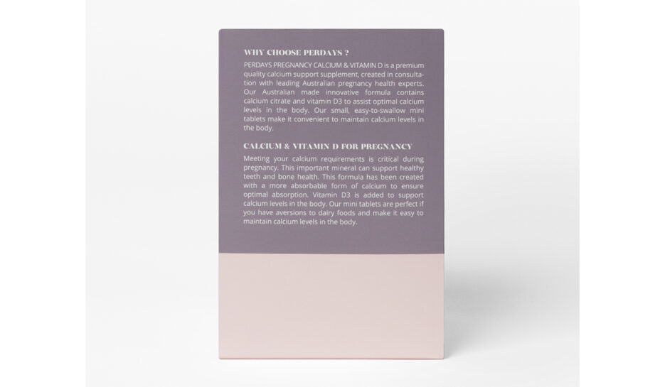 Perdays Pregnancy Calcium & Vitamin D is formulated with Australian experts to help support a healthy pregnancy. Made with highly bioavailable Calcium citrate (not calcium carbonate, commonly found in general calcium supplements). With our easy to swallow mini tablets, you can adjust your intake according to your calcium needs throughout the day for optimal absorption.